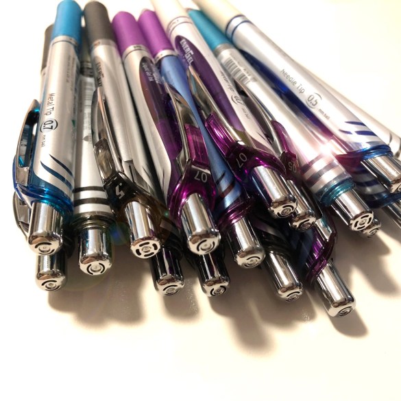 That’s not even all my pens in that brand. It really is ridiculous. I long for more time to create, and the reality is always going to be that life will intrude. Still–I fit enough in around the edges to make progress. And, like the traveler who buys a seashell when she can’t get to the beach, I’ll stockpile pens and pajamas until my kids are more interested in where I can take them than what I will play with them.